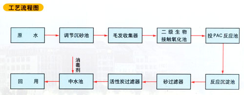 HYS系列中水處理設(shè)備采用生物和物化結(jié)合的處理方法,洗浴等污水經(jīng)中水收集管道自流入調(diào)節(jié)沉砂池,在調(diào)節(jié)池內(nèi)設(shè)有預(yù)曝氣裝置,調(diào)節(jié)池出水經(jīng)毛發(fā)收集器后用泵提升至二級接觸氧化池,污水經(jīng)生物處理后,進入混凝劑,混凝后的水用泵提升至機械過濾器及活性炭過濾器,污水進中水池并投加消毒劑,然后中水送至回用系統(tǒng)。